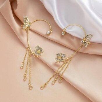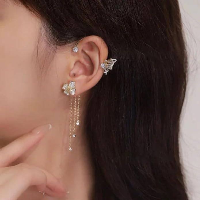 Add a graceful sparkle to your look with this Crystal Butterfly Ear Cuff, designed for modern women who love trendy and elegant jewelry. Featuring a delicate butterfly design embellished with premium cubic zirconia crystals, this stylish ear cuff creates a luxurious statement without needing multiple piercings. The beautiful tassel chains add movement and shine, making it perfect for parties, weddings, dates, and daily fashion wear.