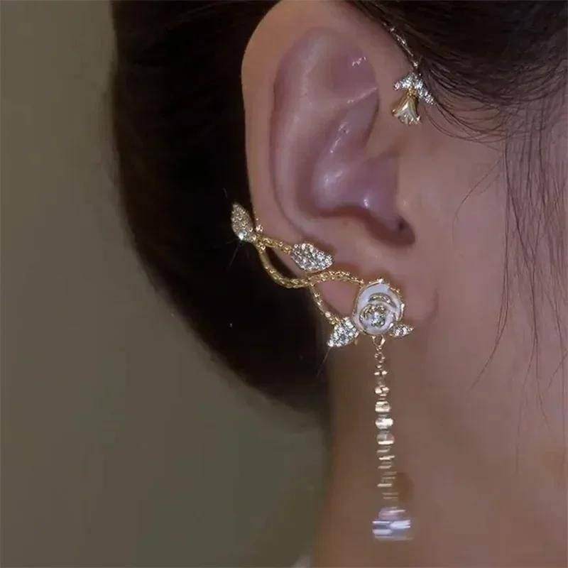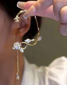 Crafted in a radiant gold finish, the design features a sparkling crystal rose centerpiece, accented with shimmering leaf details and a graceful dangling drop that moves with you. The intricate curves hug your ear comfortably, creating a layered, statement look β without the need for multiple piercings.