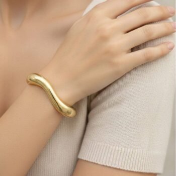 Elevate your wrist stack with our Irregular Wave Gold Bangle. Designed with a stunning, organic curve that mimics the flow of liquid gold, this bracelet is the ultimate statement piece for the modern fashionista.